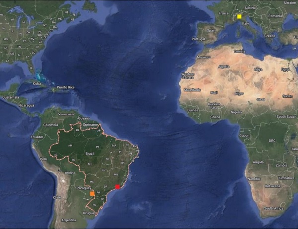 - Dove si trovano le tre cittą di questo viaggio. In giallo Milano, il punto di partenza e di arrivo. In arancio Iguazł e in rosso Rio de Janeiro. Abbiamo anche dormito una notte a San Paolo del Brasile, che č poco pił sotto di Rio, ma č stato solo per uno scalo -